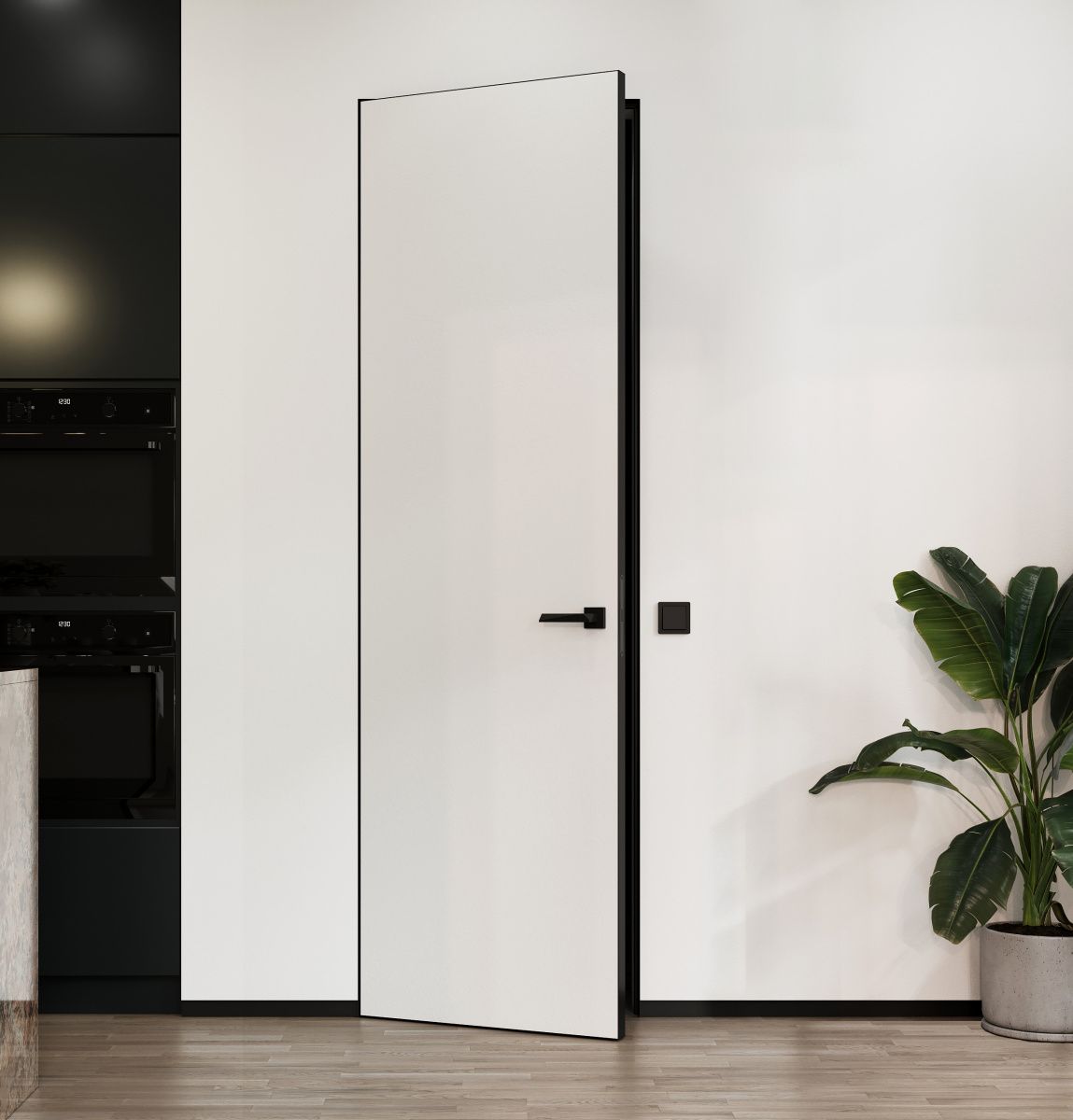 Скрытая дверь M2 Invisible с алюминиевой кромкой черного цвета полностью готова к установке уже на этапе производства. Покрытие подготовлено под самостоятельную покраску на объекте. Его можно красить в один цвет со стенами, отделывать декоративной штукатуркой или оклеивать обоями.