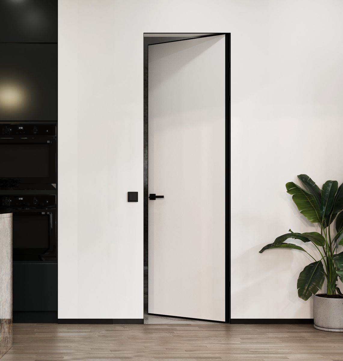 Скрытая дверь M2 Invisible с алюминиевой кромкой черного цвета полностью готова к установке уже на этапе производства. Покрытие подготовлено под самостоятельную покраску на объекте. Его можно красить в один цвет со стенами, отделывать декоративной штукатуркой или оклеивать обоями.